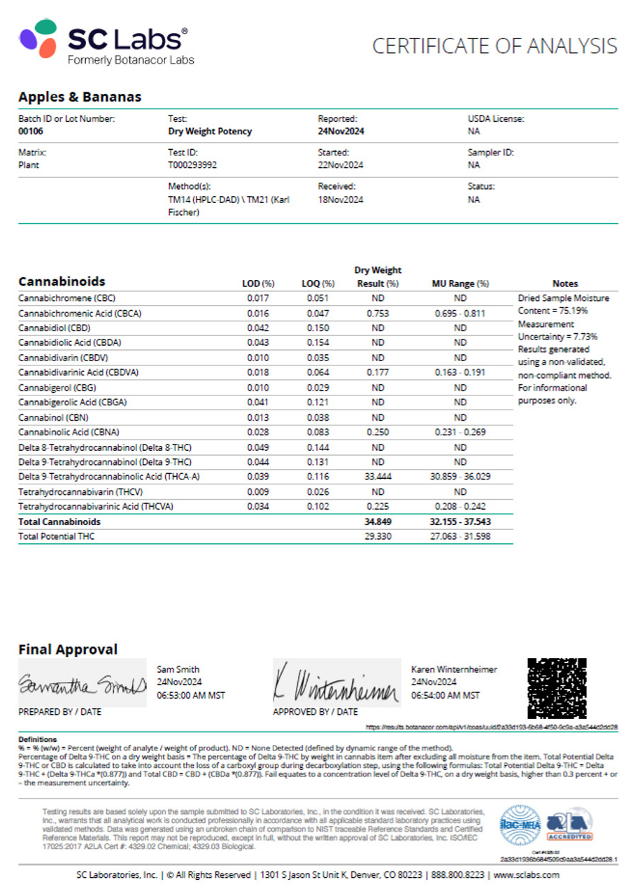 Each Apples and Bananas hemp tea batch is meticulously crafted to ensure high quality and consistency. The strain’s robust genetics contribute to its rich flavour and aroma. With a focus on compliance, all products sold comply with UK regulations concerning cannabis-derived products. The mention of THCA content at 33.44% indicates adherence to certain standards related to its cannabinoid profile. This commitment to quality ensures that you receive a premium product with every purchase.