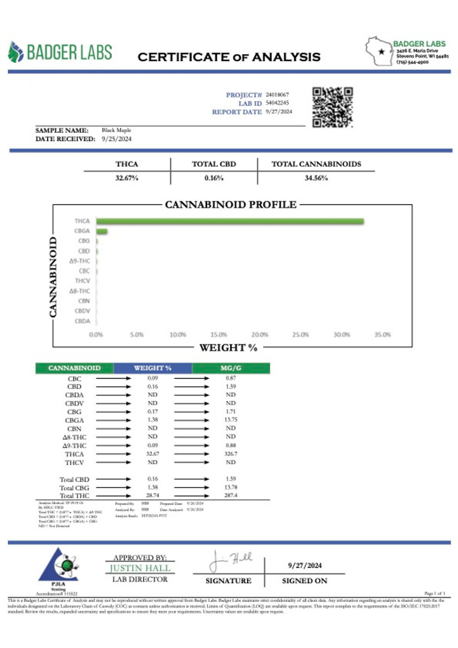 Black Maple THCA Tea is renowned for its complex and inviting terpene profile. This unique composition is highlighted by dominant terpenes such as limonene, linalool, and caryophyllene, which contribute to its sweet and gassy aroma. These terpenes enhance flavours and synergise to promote relaxation and a sense of well-being.